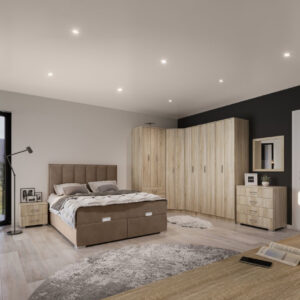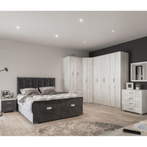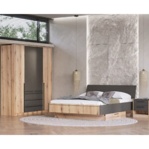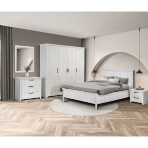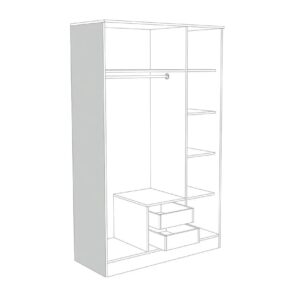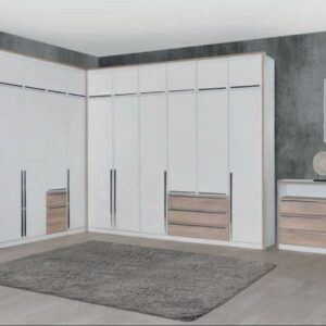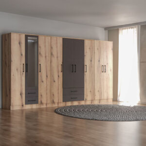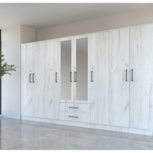 Ντουλάπα τρίφυλλη με τρία ανοιγόμενα φύλλα και δύο εξωτερικά συρτάρια. Διαθέτει εξωτερικό καθρέφτη στην μεσαία πόρτα. Έχει εσωτερικό πατάρι, σωλήνα για κρεμαστά ρούχα (κρεμάστρα) στις 2 πόρτες, ραφιέρα 5 επιπέδων στην ακριανή πόρτα. Κατασκευάζεται από υψηλής ποιότητας και πυκνότητας μοριοσανίδα (μελαμίνη) πάχους 16 mm, των ευρωπαίων παραγωγών EGGER, KRONOSPAN. Με πιστοποιημένους και εγγυημένους μηχανισμούς των…