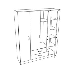 Ντουλάπα τετράφυλλη με τέσσερα ανοιγόμενα φύλλα και δύο εξωτερικά συρτάρια. Ιδανική σχέση τιμής, ποιότητας, μεγέθους. Έχει εσωτερικό πατάρι, σωλήνα για κρεμαστά ρούχα (κρεμάστρα) στις 2 μεσαίες πόρτες, ραφιέρα 5 επιπέδων στις 2 ακριανές πόρτες. Κατασκευάζεται από υψηλής ποιότητας και πυκνότητας μοριοσανίδα (μελαμίνη) πάχους 16 mm, των Ευρωπαίων παραγωγών EGGER, KRONOSPAN. Με πιστοποιημένους και εγγυημένους μηχανισμούς…