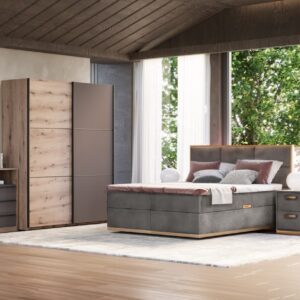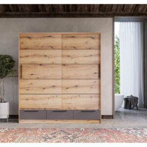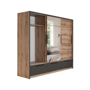 Συρόμενη ντουλάπα βαρέως τύπου AP 230εκ. σε μοντέρνο συνδυασμό φυσικό artisan με ανθρακί χρώμα. Στο δεξί μέρος έχει έναεσωτερικό πατάρι και σωλήνα για κρέμαση, ενώ στο αριστερό τμήμα της παρέχει έναεσωτερικό πατάρι, σωλήνα για κρέμαση, τέσσερα επίπεδα ράφια και δύο εσωτερικάσυρτάρια με τηλεσκοπικούς μηχανισμούς κίνησης. Δυνατότηταπροσαρμογής εξωτερικού καθρέφτη στην πόρτα. Κατασκευάζεται από υψηλής ποιότητας και πυκνότηταςμοριοσανίδα (μελαμίνη)…