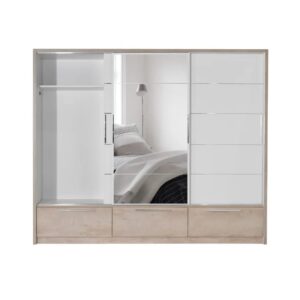 Συρόμενη ντουλάπα βαρέως τύπου AP 270εκ. σε μοντέρνο συνδυασμό άσπρο δρύς του πάγου με ανθρακί χρώμα. Στο δεξί μέροςέχει πέντε επίπεδα ράφια, στο μεσαίο μέρος ένα εσωτερικό πατάρι και σωλήνα γιακρέμαση, ενώ στο αριστερό τμήμα της παρέχει ένα εσωτερικό πατάρι, σωλήνα γιακρέμαση και δύο εσωτερικά συρτάρια με τηλεσκοπικούς μηχανισμούς κίνησης. Δυνατότητα προσαρμογής εξωτερικού καθρέφτη στην…