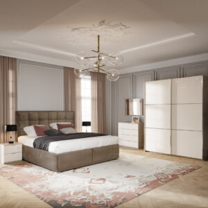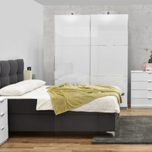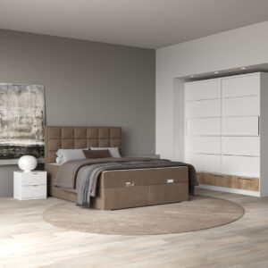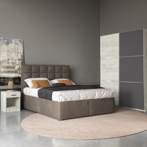 Ντουλάπα με 2 πόρτες συρόμενες, αλουμινίου χούφτες ανοίγματος, και μεταλλικές λεπτομέρειες στις πόρτες. Μηχανισμός βαρεού τύπου Hettich, εξωτερικής κίνησης των πορτών. Έχει 2 εσωτερικά συρτάρια, ραφιέρα πάνω από την συρταριέρα, πατάρι κατά μήκος και μεταλλική μπάρα για κρέμασμα. Μπορείτε να το συνδυάσετε και με εξωτερικό φωτισμό. Χρησιμοποιώντας καινούργια υλικά αρίστης ποιότητας, μοριοσανίδα FUNDERMAX, μηχανισμοί Hettich,…
