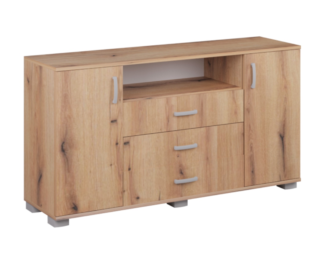 Ιδανικό και για βάση τηλεόρασης. Διαθέτει ντουλάπια, ράφια 3 επιπέδων στα δύο πορτάκια δεξιά και αριστερά του επίπλου, ενώ στην μέση 3 εξωτερικά βαθιά συρτάρια. Επίσης διαθέτει στη μέση του επίπλου ράφι ανοικτού τύπου για dvd, cd, home cinema… Κατασκευάζεται από υψηλής ποιότητας και πυκνότητας μοριοσανίδα (μελαμίνη) πάχους 18 mm των ευρωπαίων παραγωγών EGGER, KRONOSPAN. Με πιστοποιημένους και εγγυημένους μηχανισμούς των ευρωπαϊκών οίκων INCOLL, HETTICH, TITUS. Μεταλλικά χερουλάκια – πόμολα του ευρωπαϊκού οίκου RUJZDESIGN . Τελείωμα ABS σόκορο, soft forming. Υψηλή αισθητική, άριστη ποιότητα, οικονομική, λειτουργική.