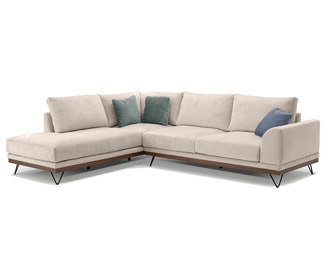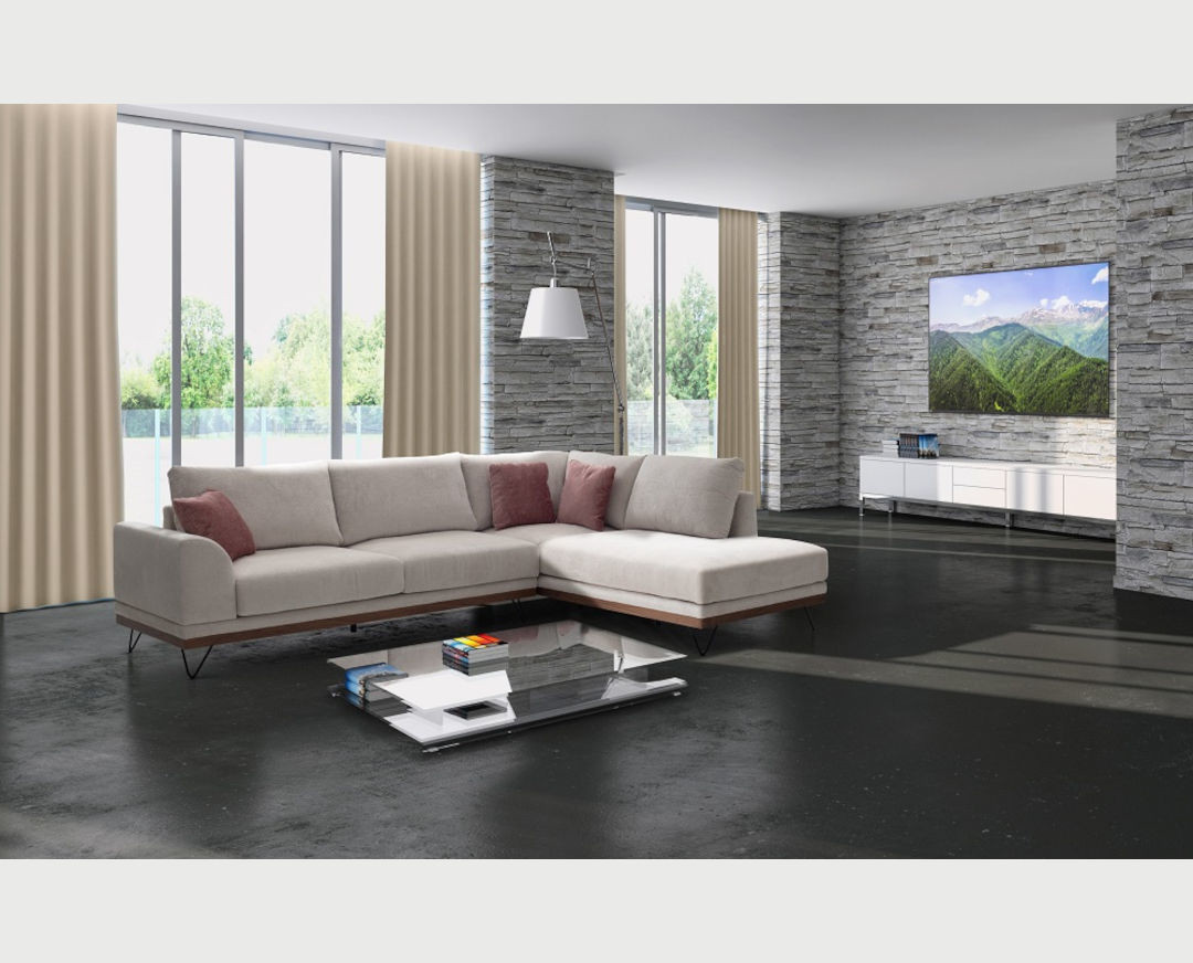 Ετοιμοπαράδοτος δεξής γωνιακός καναπές VM-RENE με ξύλινη μπάζα, αποσπώμενα- πλενόμενα καλύμματα έδρας και πλάτης ύφασμα perfect 02 μπεζ 290x240x98