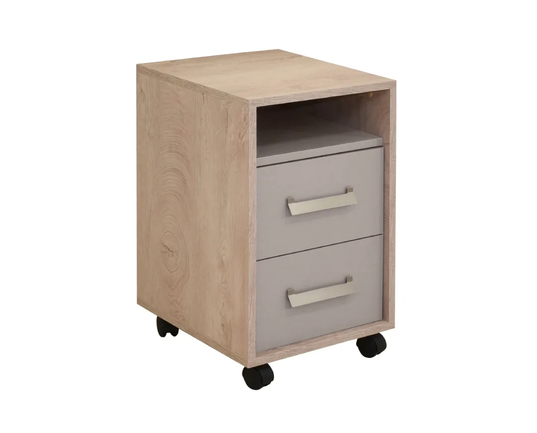 Τροχήλατο κομοδίνο με 2 βαθιά συρτάρια και ένα ράφι αποθήκευσης άνω των συρταριών. Βασικό χρώμα σε μοντέρνο δρυς KINDER – PREMIUM και λεπτομέρειες σε 4 χαρούμενα χρώματα…για χαρούμενη ενέργεια. Κατασκευάζεται από υψηλής ποιότητας και πυκνότητας μοριοσανίδα (μελαμίνη) πάχους 25 mm, των ευρωπαίων παραγωγών EGGER, KRONOSPAN. Χερουλάκι σε χρώμα inox από pvc. Τελείωμα ABS σόκορο.