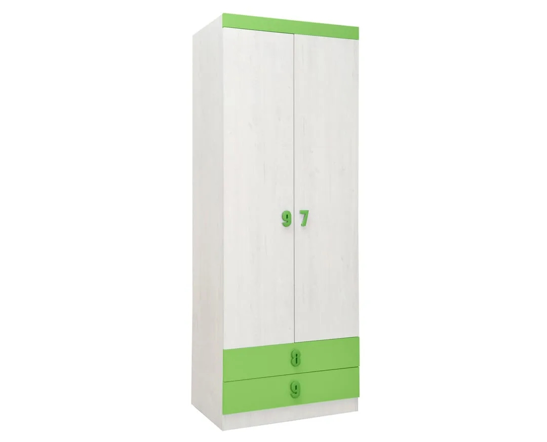 Ντουλάπα δίφυλλη με 2 μεγάλα εξωτερικά συρτάρια. Διαθέτει 1 ράφι πατάρι και μεταλλική μπάρα για κρέμαση. Βασικό χρώμα σε μοντέρνο άσπρο δρύ και λεπτομέρειες σε 5 χαρούμενα χρώματα…για χαρούμενη ενέργεια. Κατασκευάζεται από υψηλής ποιότητας και πυκνότητας μοριοσανίδα (μελαμίνη) πάχους 18 mm των ευρωπαίων παραγωγών EGGER, KRONOSPAN. Με πιστοποιημένους και εγγυημένους μηχανισμούς των ευρωπαϊκών οίκων INCOLL , HETTICH , TITUS. Χερουλάκια – πόμολα σε σχήμα αριθμών και 5 διαφορετικών χρωμάτων. Τελείωμα ABS σόκορο.