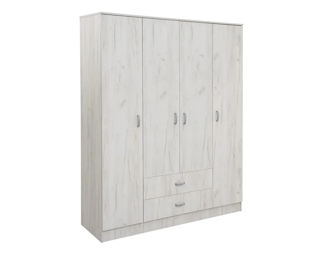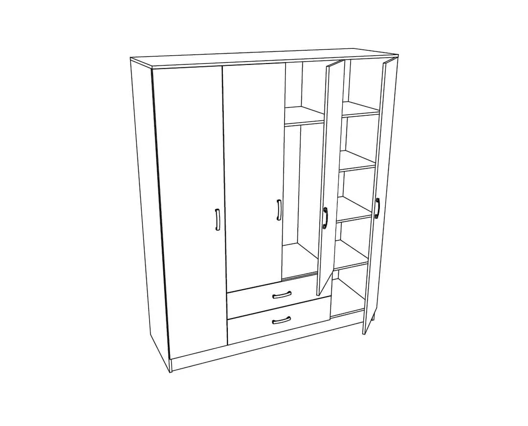 Ντουλάπα τετράφυλλη με τέσσερα ανοιγόμενα φύλλα και δύο εξωτερικά συρτάρια. Ιδανική σχέση τιμής, ποιότητας, μεγέθους.