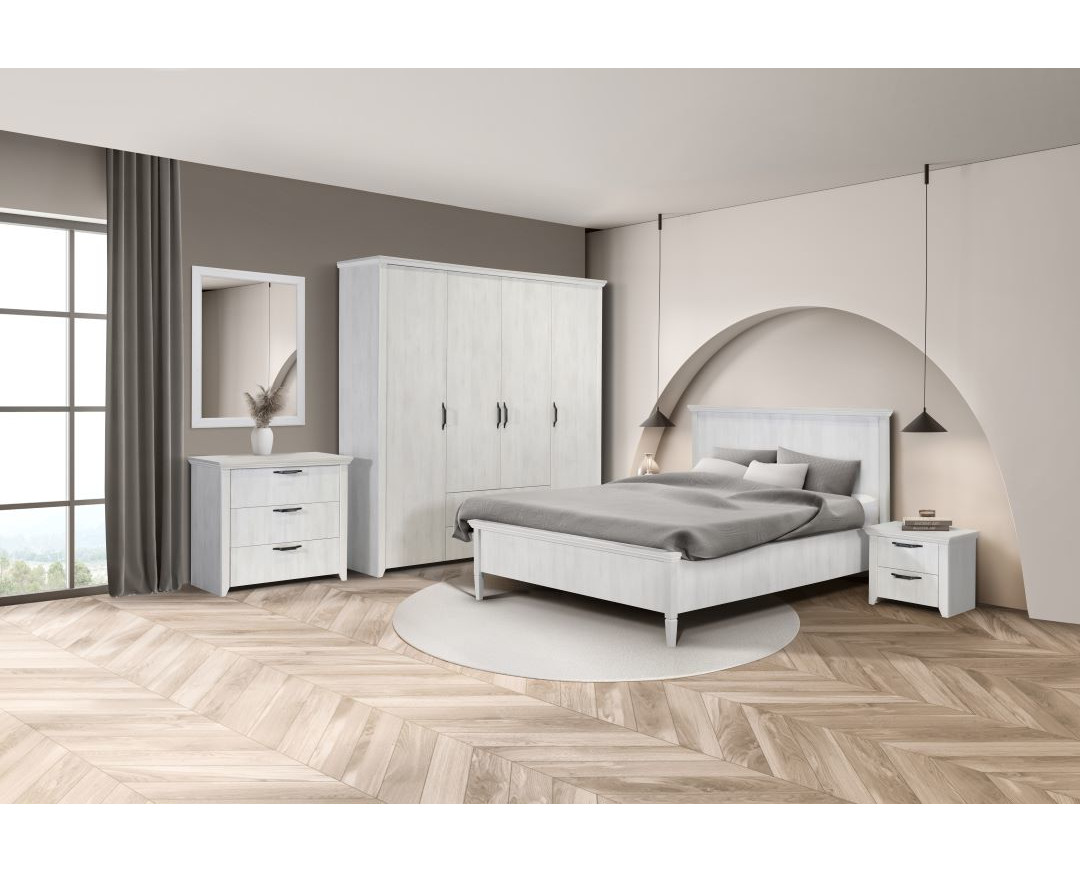 Ντουλάπα Rustic τετράφυλλη με δύο κεντρικά εξωτερικά συρτάρια με τηλεσκοπικούς μηχανισμούς, σε ρετρό λευκό χρώμα και vintage στυλ. Δυνατότητα προσαρμογής εξωτερικού καθρέφτη στην πόρτα.