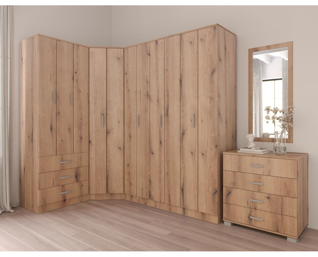 Ντουλάπα δίφυλλη με σπαστά φύλλα τύπου φυσούνας. Έχει ένα εσωτερικό πατάρι, σωλήνα για κρέμαση και τρία εξωτερικά βαθιά συρτάρια. Κατασκευάζεται από υψηλής ποιότητας και πυκνότητας μοριοσανίδα (μελαμίνη) πάχους 18 mm, των ευρωπαίων παραγωγών EGGER, KRONOSPAN. Με πιστοποιημένους και εγγυημένους μηχανισμούς των ευρωπαϊκών οίκων INCOLL , HETTICH , TITUS .Μεταλλικά χερουλάκια – πόμολα του ευρωπαϊκού οίκου RUJZDESIGN. Τελείωμα ABS σόκορο.