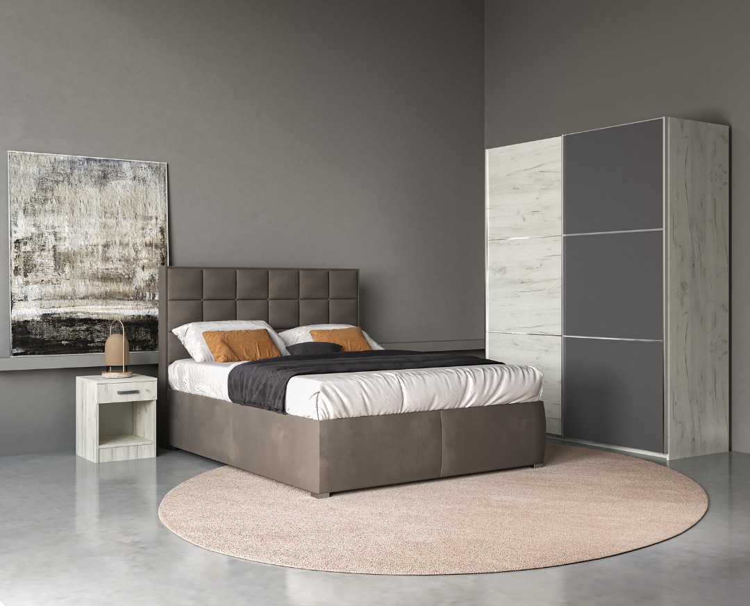 Συρόμενη ντουλάπα βαρέως τύπου AP 230εκ. σε μοντέρνο συνδυασμό άσπρο δρύς τουπάγου με ανθρακί χρώμα. Στο δεξί μέρος έχει ένα εσωτερικό πατάρι και σωλήνα γιακρέμαση, ενώ στο αριστερό τμήμα της παρέχει ένα εσωτερικό πατάρι, σωλήνα γιακρέμαση, τέσσερα επίπεδα ράφια και δύο εσωτερικά συρτάρια με τηλεσκοπικούςμηχανισμούς κίνησης. Δυνατότητα προσαρμογής εξωτερικούκαθρέφτη στην πόρτα.